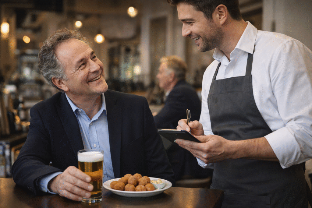 “Meneer De Vries, de gebruikelijke? Pilsje en bitterballen?”